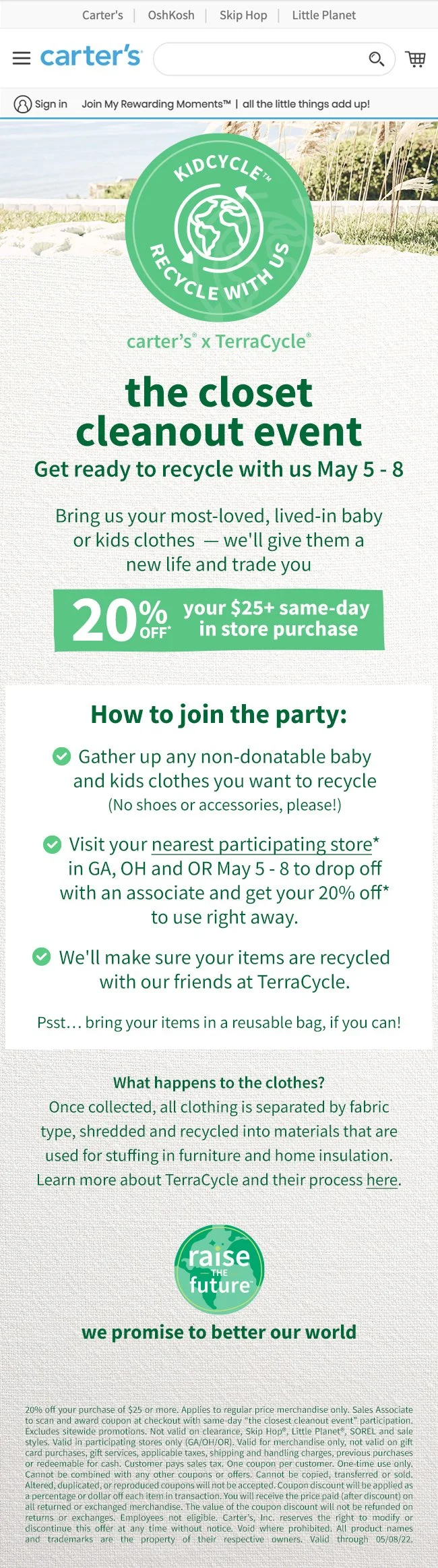 Partnership with TerraCycle to donate used clothing to be recycled or upcycled into new products.
